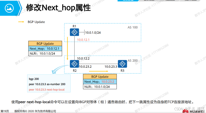 - 当BGP将本地始发路由发布给IBGP对等体的时候,会将下一跳属性设置为本地与对端建立邻居关系的接口地址。