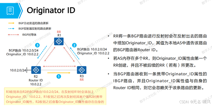 我们引进了RR的概念,这样就打破了IBGP之间不能进行路由传递的规则,可能会造成路由环路,为了防止路由环路,我们引进了两个特殊的路径属性:originator_ID、Cluster_list。