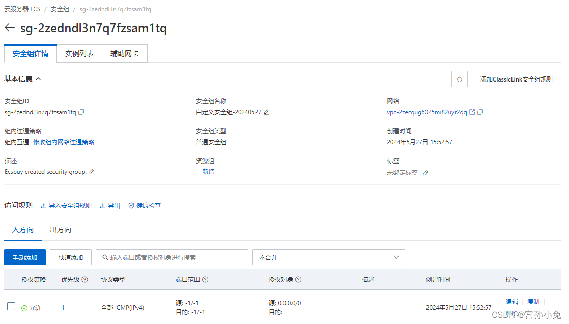 入方向代表公网用户(IP地址或网段)可访问该服务器的端口或协议。实际上,我们在购买ECS服务时,已经选择了SSH(远程运维)、HTTP(网站)、HTTPS(网站)、ICMP(PING)4个端口或协议。可在此处进行修改。