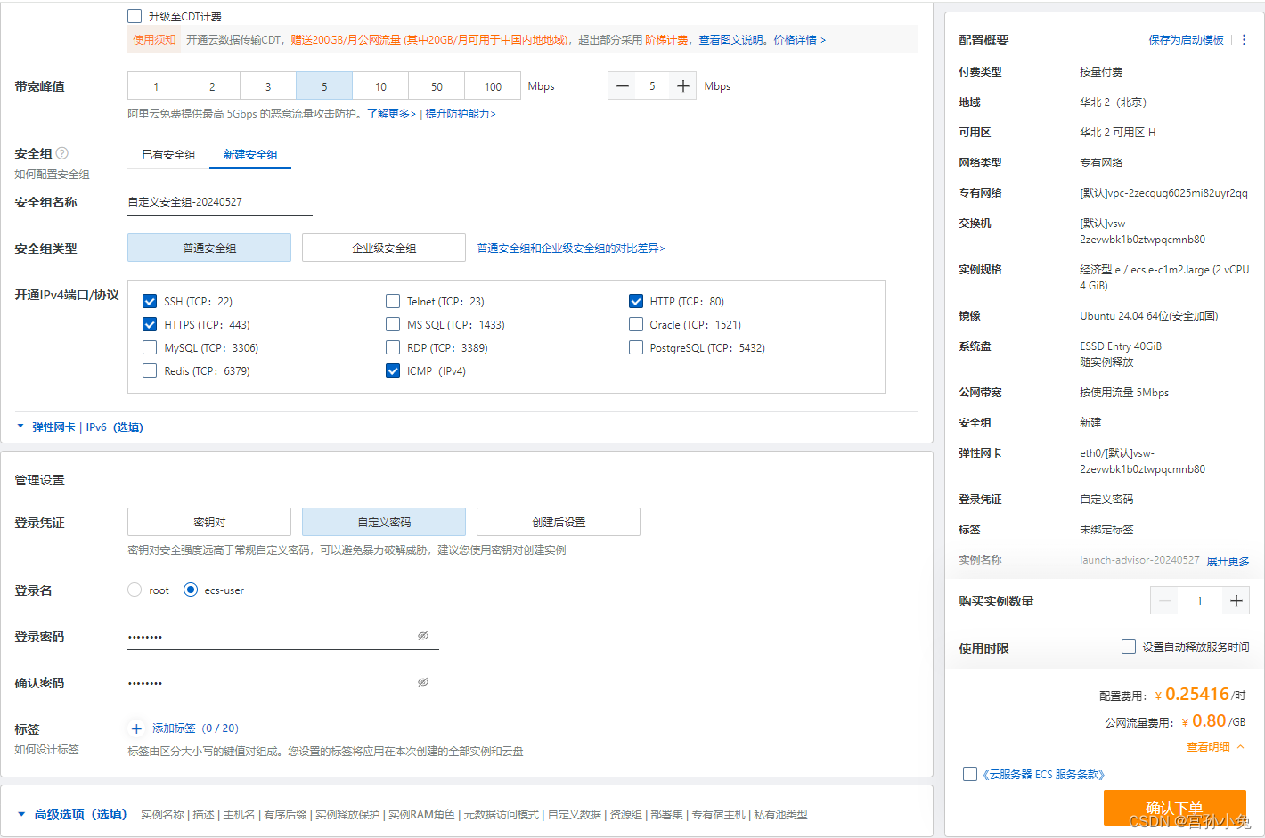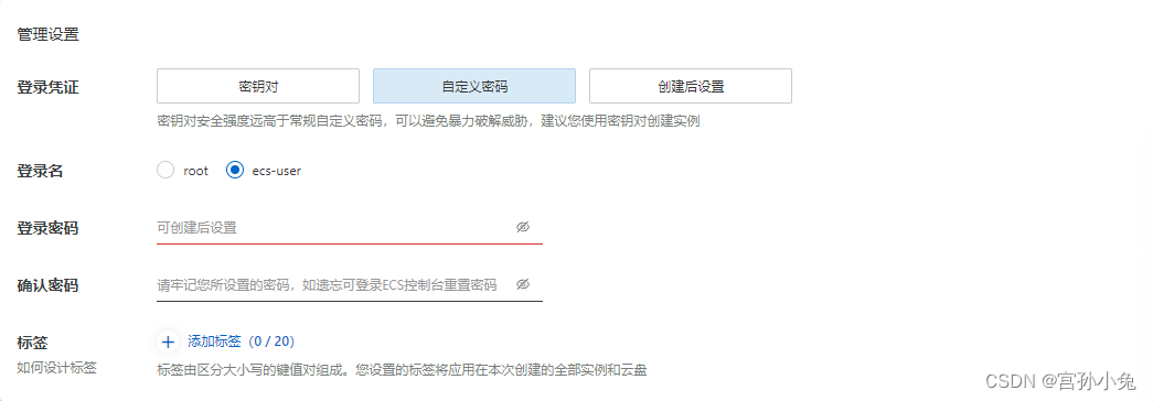 本文选择“自定义密码”,Ubuntu不建议直接使用root用户登录,为了安全,阿里云默认提供了一个普通用户ecs-user ,我们选择此用户,配置相应登录密码即可。