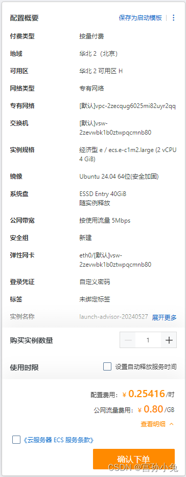 勾选“《云服务器 ECS 服务条款》”,点击“确认下单”。
