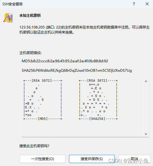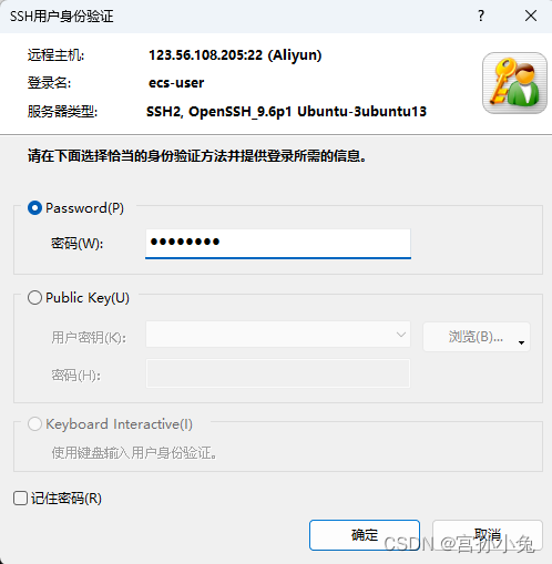输入ECS服务器密码。根据自身情况,可选择“记录密码”,则下次连接不再提示。点“确定”按钮。