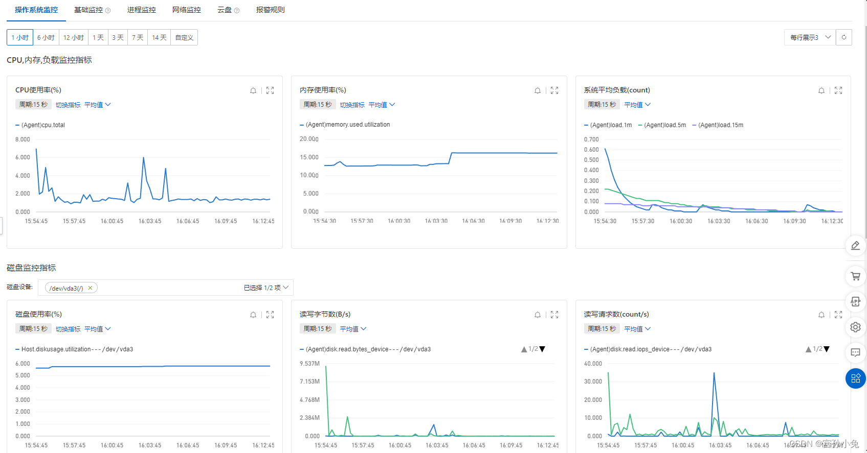 可见,阿里云提示非常丰富的监控指标。包括 CPU、内存、负载、磁盘、网络、进程、连接数以及报警事件等多时间维度的监控。非常便于在线维护。