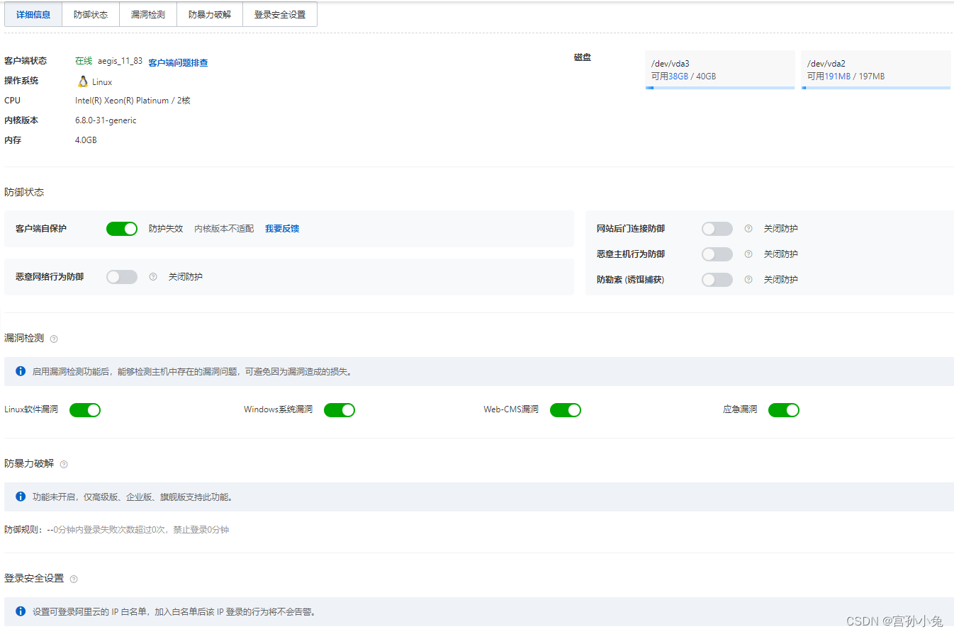 阿里云ECS具备基本的免费漏洞检测能力。可根据通知手动安装系统漏洞补丁或升级。