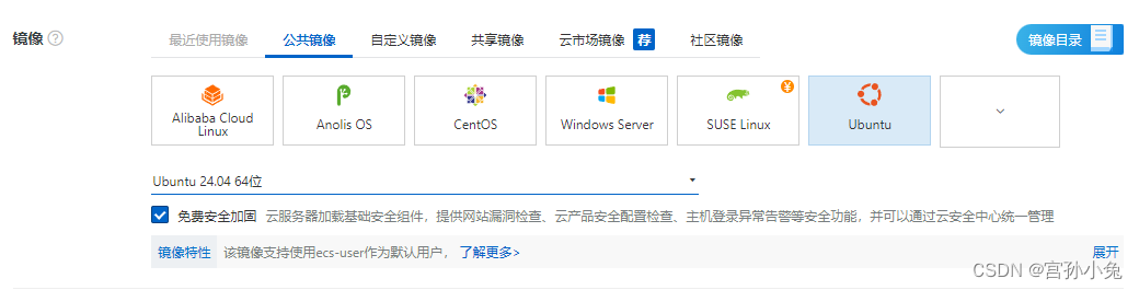 选择镜像,Ubuntu 版本选择 24.04 64位。