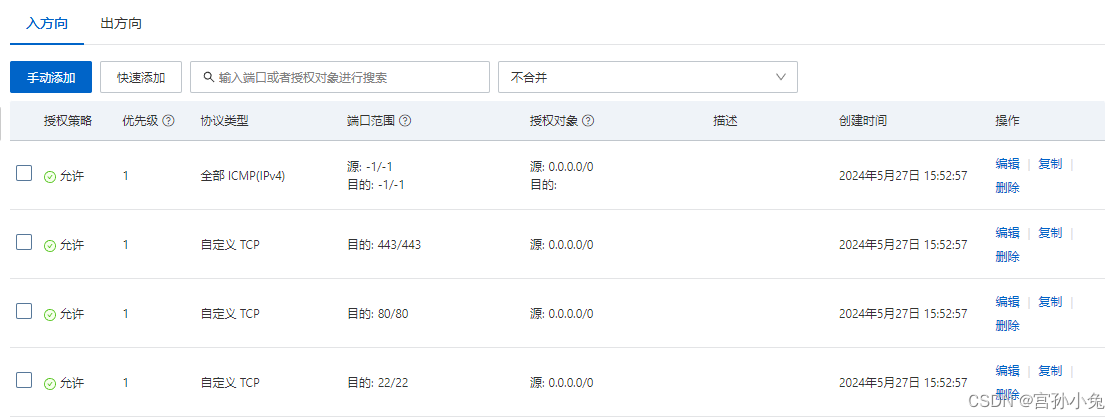 进行安全组配置页面。分为“入方向”和“出方向”的配置。