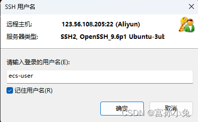 输入用户名 ecs-user,可选择“记录用户名”,则下次连接不再提示。点“确定”按钮。