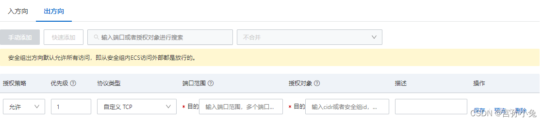 出方向表示允许或禁止ECS服务器访问公网的端口或协议。安全组出方向默认允许所有访问,即从安全组内ECS访问外部都是放行的。如果需要控制,可在此处配置。