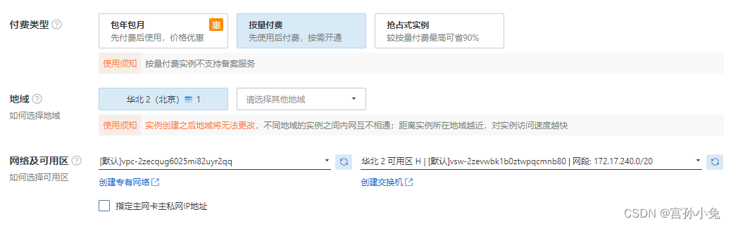 我们可以理解为一个独立的局域网络。如果仅有一台ECS,一般默认VPC,选择一个可用区默认交换机即可。如果有多台ECS要在一个局域网内,请确保选择相同的VPC和可用区交换机。 本文为单独一台ECS,随意选择一个默认VPC和可用区交换机即可。