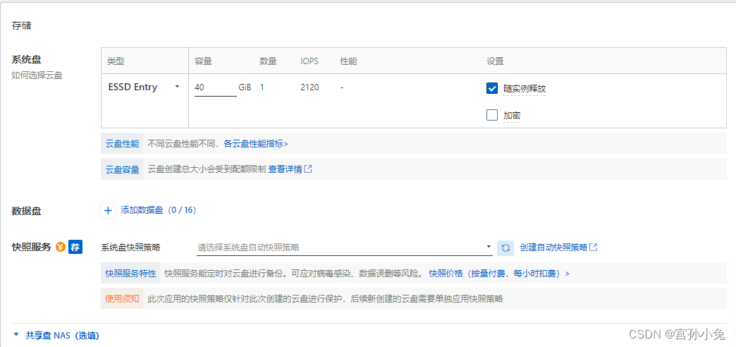 存储配置,默认系统盘为40GB,可根据需要更改。也可添加多个数据盘。系统盘快照策略可选可空。如果选择会有相应的费用。快照服务能定时对云盘进行备份。