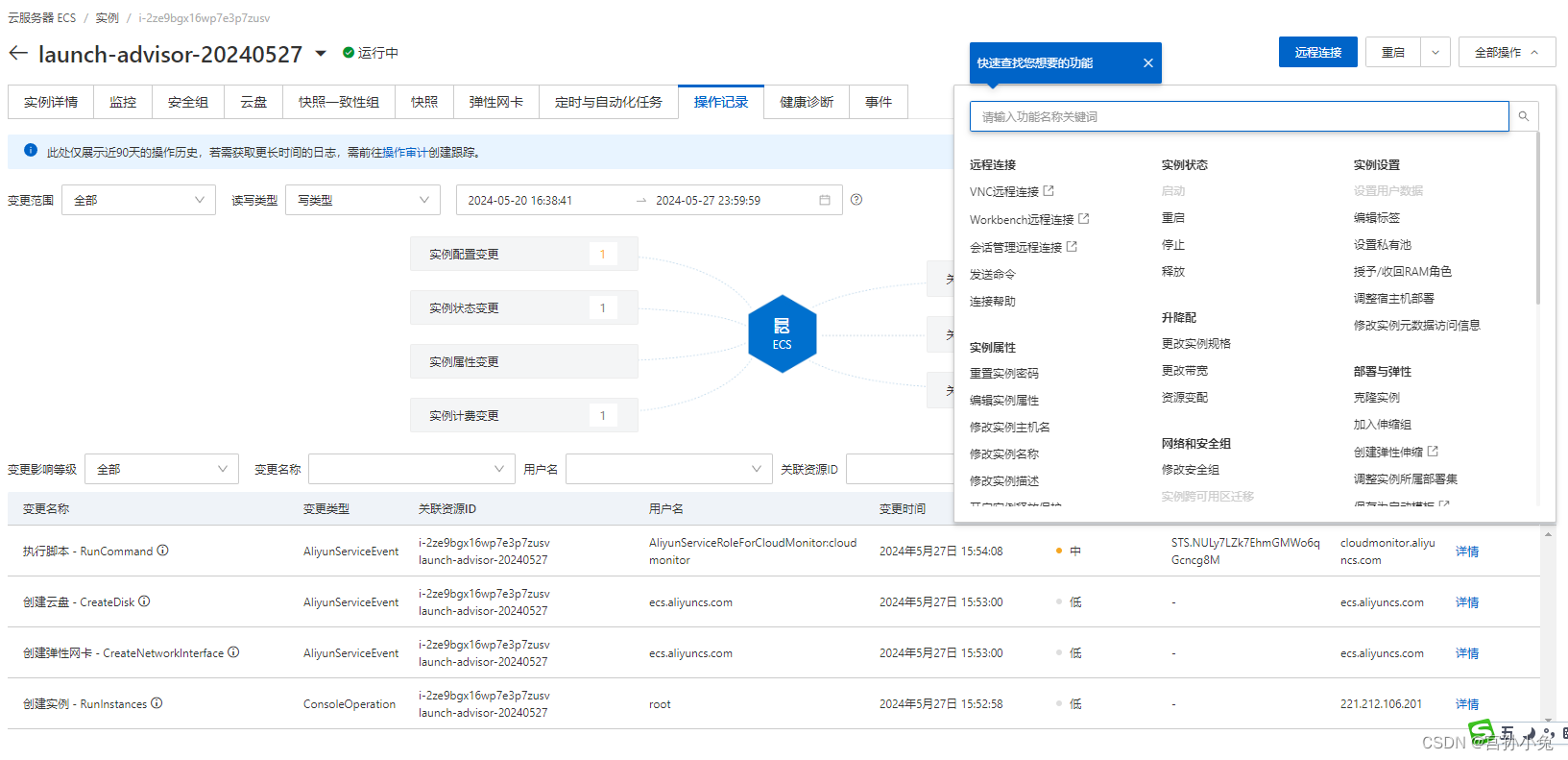 此外,实例详情中,提供了对该ECS服务器的所有 控制按钮、操作记录。