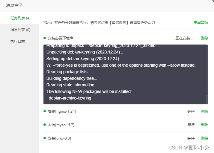 通过下拉框选择计划安装的环境软件版本,选择极速安装后,点击一键安装。面板会自动添加到任务中。可显示安装的过程。非常方便,不需要再通过命令行来安装这些服务器环境。在面板的左上角,会自动显示任务的数量,点击后进入任务列表。