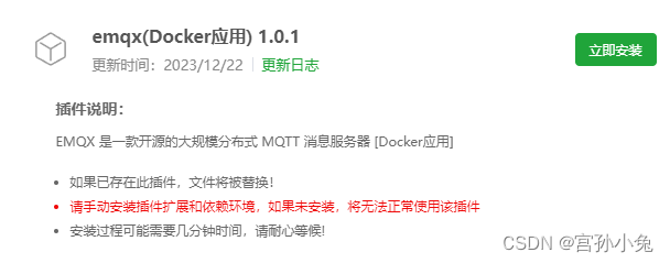 以安装mqtt应用为例,如下图。搜索后,相关结果中,我选择emqx 点击“安装”。