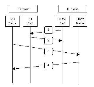 在第1步中,客户端的命令端口与FTP服务器的命令端口建立连接,并发送命令“PORT 1027”。然后在第2步中,FTP服务器给客户端的命令端口返回一个"ACK"。在第3步中,FTP服务器发起一个从它自己的数据端口(20)到客户端先前指定的数据端口(1027)的连接,最后客户端在第4步中给服务器端返回一个"ACK"。
