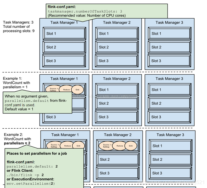 2)为了控制一个TaskManager能够接收多少个task,TaskManager通过task slot来进行控制(一个TaskManager至少有一个slot)