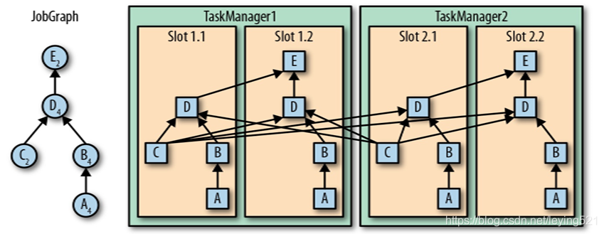 4)ExecutionGraph:JobManager根据JobGraph生成ExecutionGraph。ExecutionGraph是JobGraph的并行化版本,是调度层最核心的数据结构;