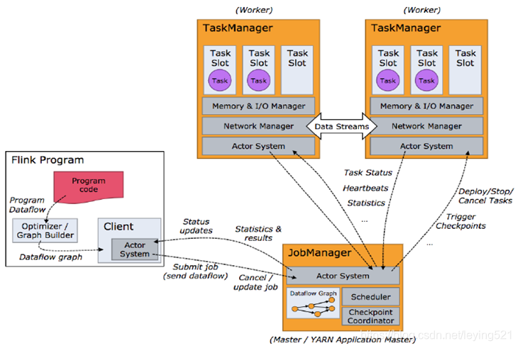 3)在执行过程中,一个TaskManager可以跟其它运行同一应用程序的TaskManager交换数据。