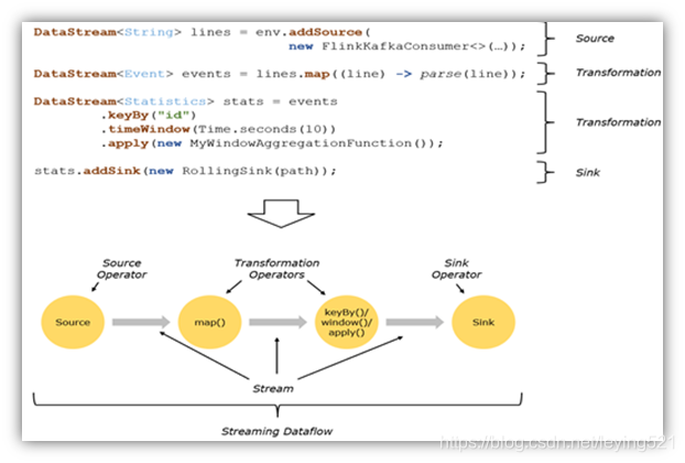 5)在大部分情况下,程序中的转换运算(Transformation)跟dataflow中的算子(operator)是一一对应的关系;