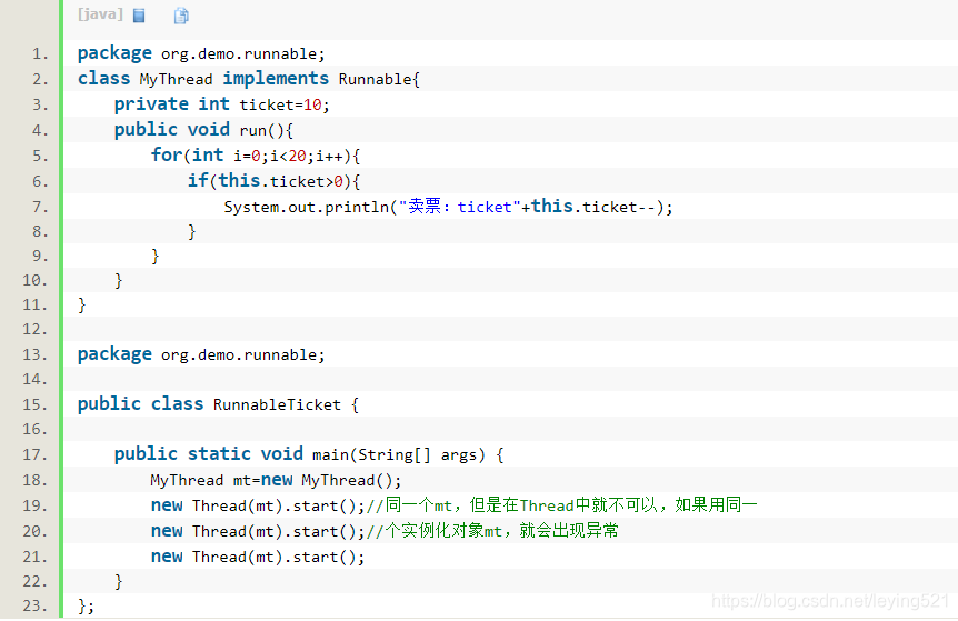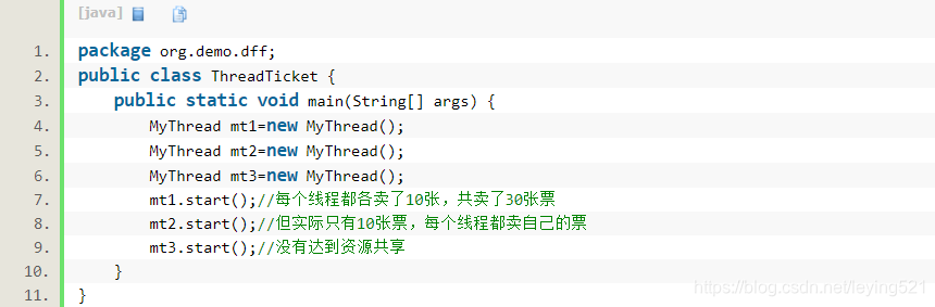 虽然现在程序中有三个线程,但是一共卖了10张票,也就是说使用Runnable实现多线程可以达到资源共享目的。