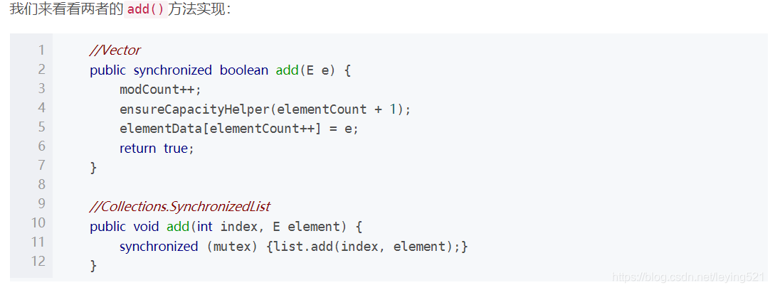 可以看出, 两者实现多线程的方式都是对集合的方法加锁,区别在于,Vector是对方法加锁,锁的是本对象,而Collections.synchronizedXXX(…)是对一个变量加锁。区别并不大。
