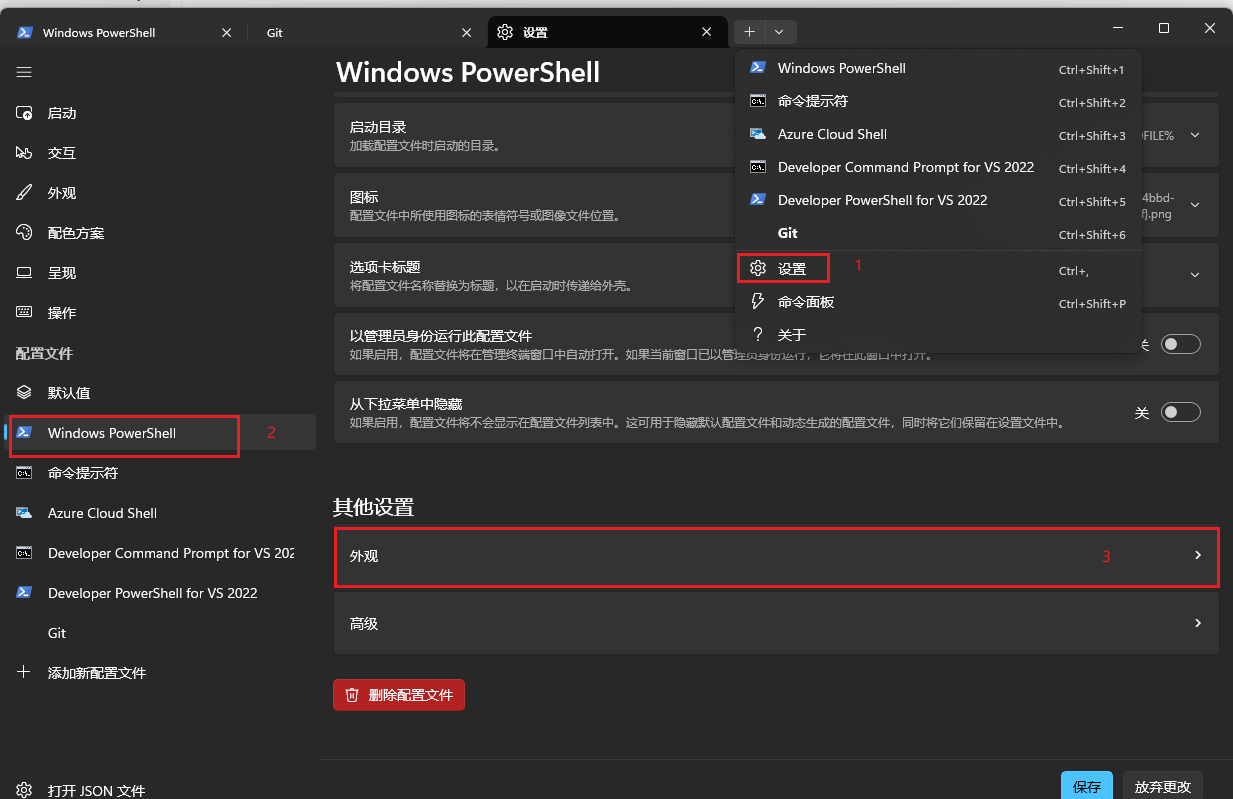打开termainl。选择设置-> powershell-> 外观 -> 字体 -> MesloLGL Nerd Font
