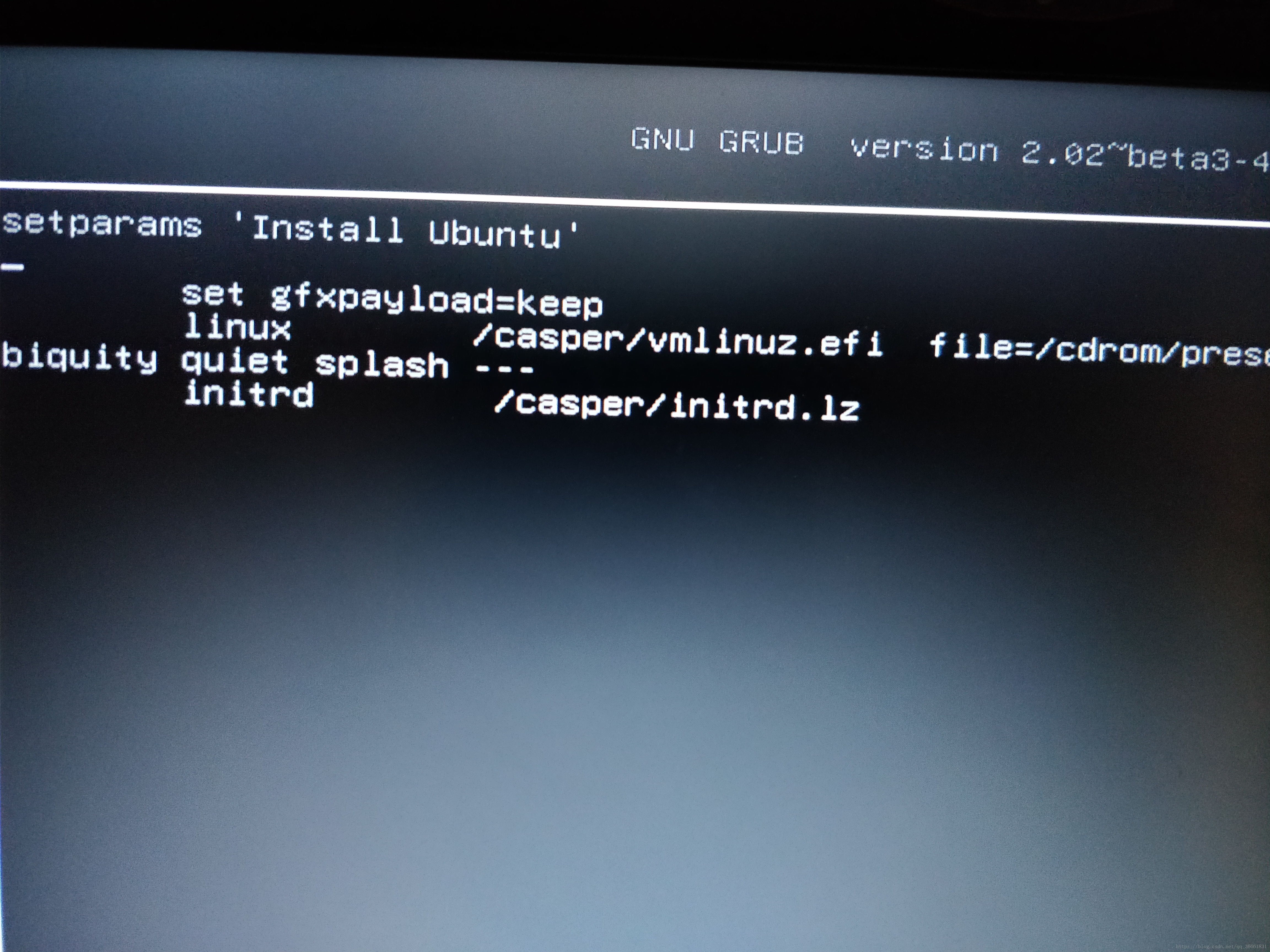 ,选择Install Ubuntu,然后按键盘上的e键,进入图
