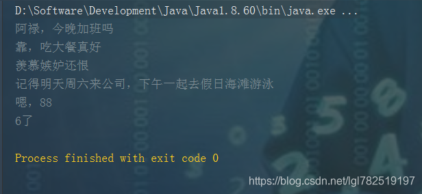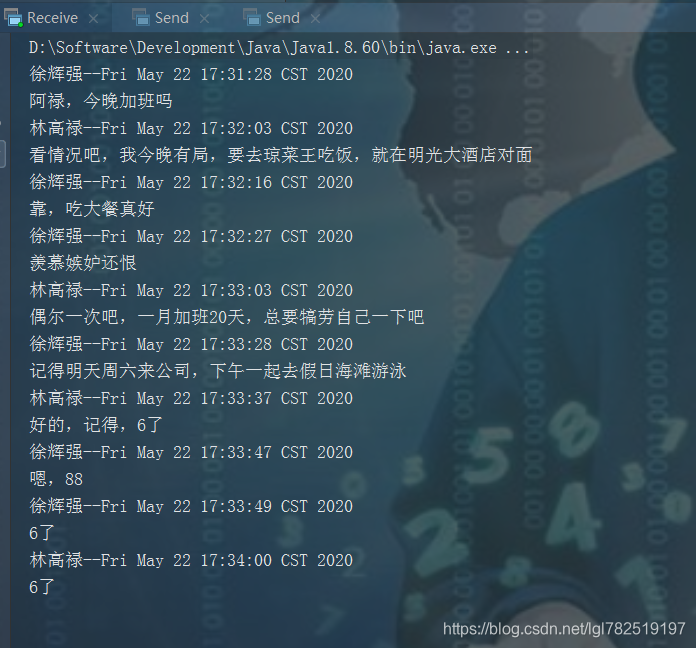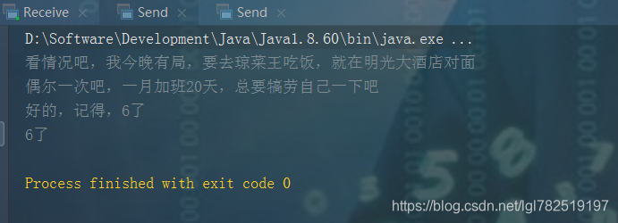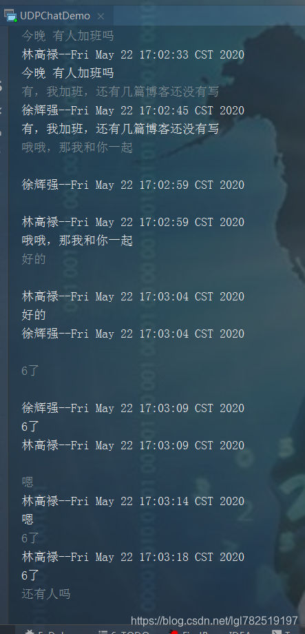 灰色的字是键盘输入的,白色的字是接收端输出的,这个聊天记录有点乱,还有空行什么的,是因为我们是用多线程来做,键盘输入的时候线程时随机的,并且输入完毕的时候,不一定到接收线程接收,有可能是另一个客户端线程,所以会出现这种情况,如果想改进,那就得把客户端单独拿出来另一个主方法,我们修改一下