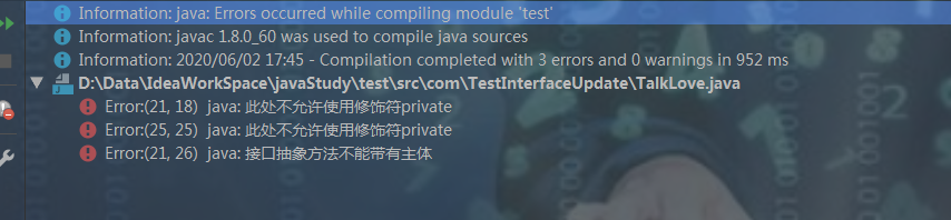 我们仔细看一下恋爱的接口TalkLove的代码,发现有想法、等待、终于等到都是重复的,那我们可不可以共用,这就需要接口的私有方法来处理了,同接口的静态方法一样,私有方法实现类不能重写,也不能通过实现类来调用,毕竟是私有的。