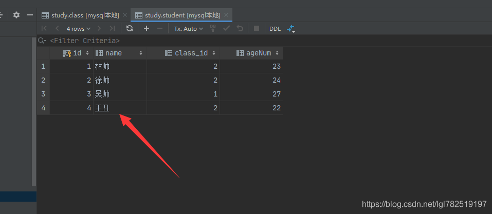 我们先把学生表的字段和值修改一下,原来的ageNum改为num_age,并且把“徐帅”的num_age置为null
