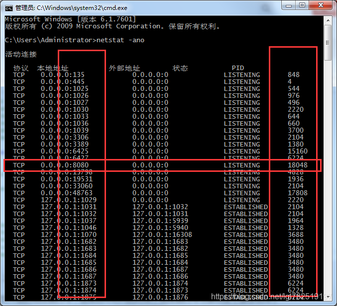打开黑窗口,输入netstat -ano,找到需要杀死端口的相应PID(进程ID)