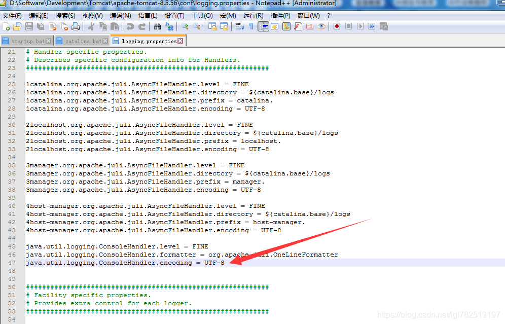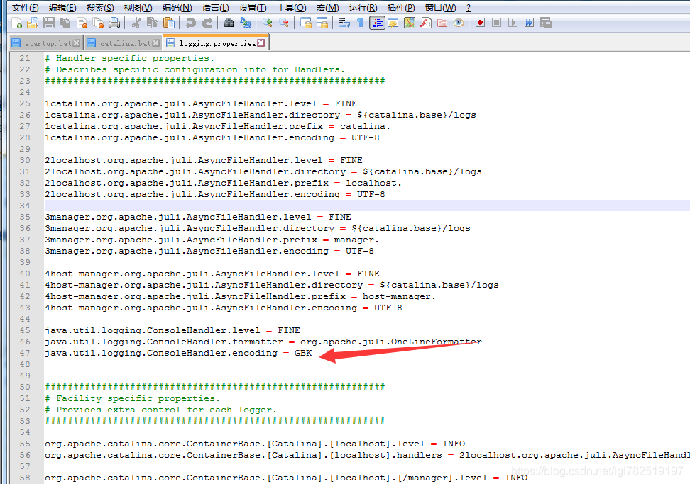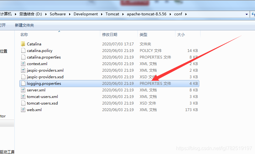找到tomcat配置文件conf目录下的logging.properties文件,打开