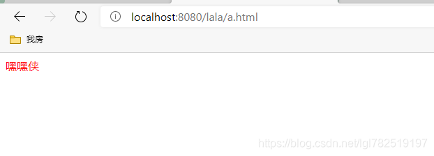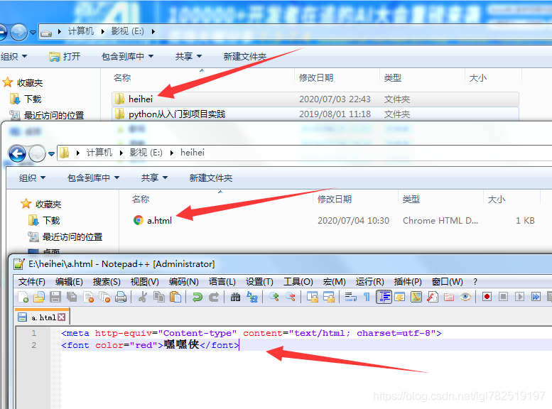 在E盘的文件夹里面定一个heihei项目,里面只有a.html文件,文件内容为你红色字:嘿嘿侠