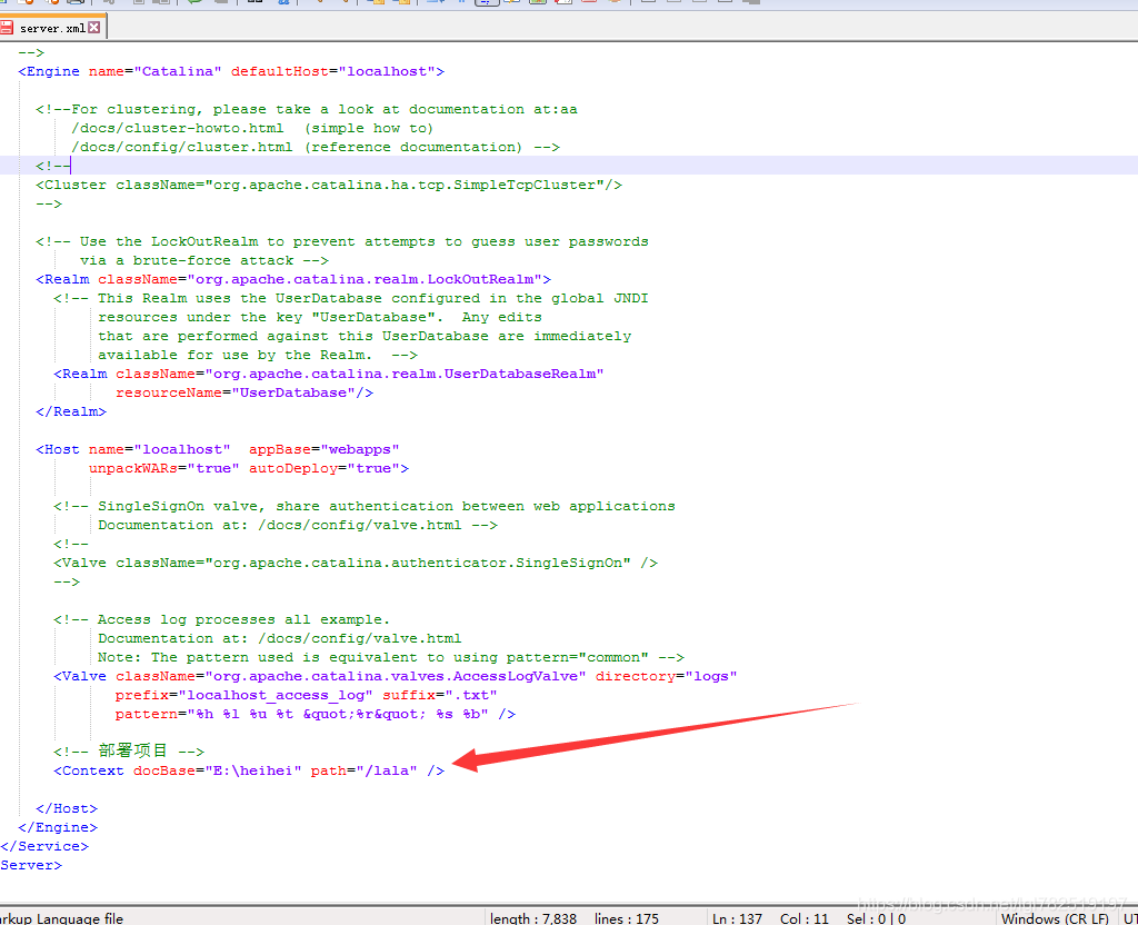 加入以下配置:<Context docBase="E:\heihei" path="/lala" />
