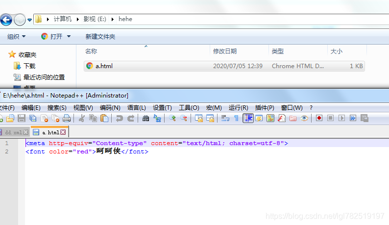 在E盘的文件夹里面定一个hehe项目,里面只有a.html文件,文件内容为你红色字:呵呵侠
