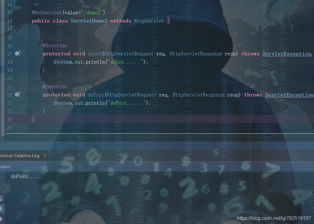 发现HttpServlet已经帮我们实现了service方法,里面对GET、POST等7中请求方式做了判断分别走不同的逻辑,那我们实际上的是需要重写这7个请求方法就可以了,实际上我们常用的就是GET和POST,我们的ServletDemo3就重写这2个方法