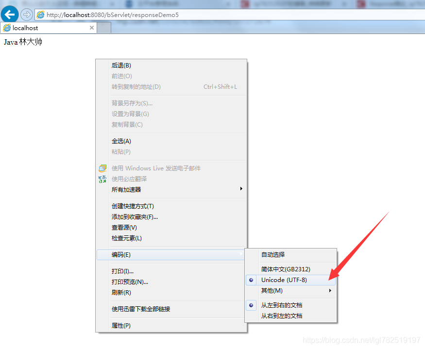 现在我们有一款浏览器的默认解码字符集为UTF-8,那么好的,我们就把Response字符集改为UTF-8,但是这时候,IE浏览器访问是不是乱码了,所以呢我们还得该告诉浏览器使用什么字符集编码。