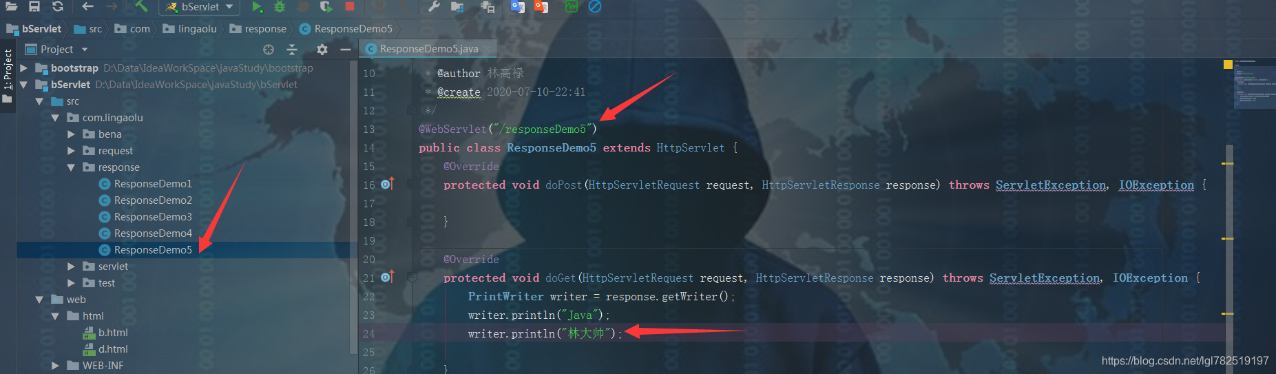 字节输出流ServletOutputStream outputStream = response.getOutputStream()和字符输出流PrintWriter writer = response.getWriter()原理是一样的,这里用字符流举例。