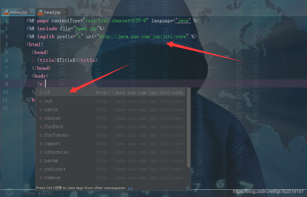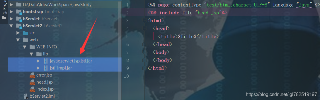 我们在index.jsp导入JSTL的标签的资源,就能使用其标签(这里只是演示taglib指令,运行可能会报错,详细看这里JSTL的导入和使用)