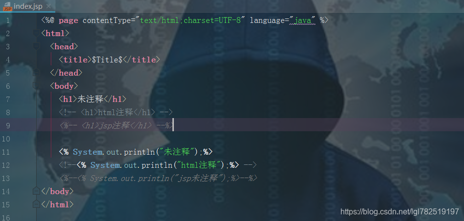 - html注释只能注释html标签内容,不能注释jsp标签内容,比如html注释就注释掉了<hi>标签,但是不能注释<%%>的java代码