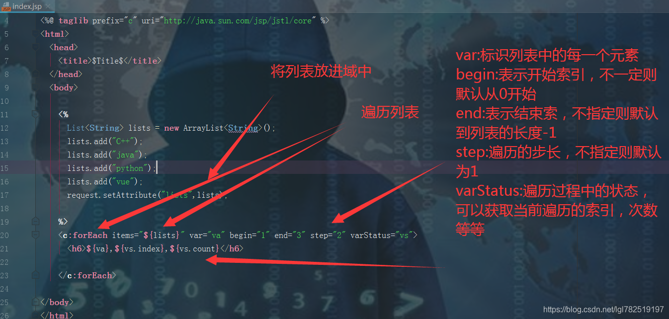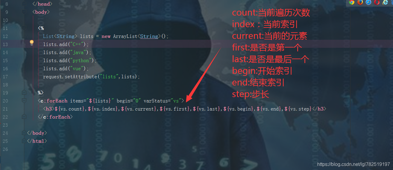 访问结果,因为我们forEach标签里属性没有指定end和step,所以varStatrus获取到的为空