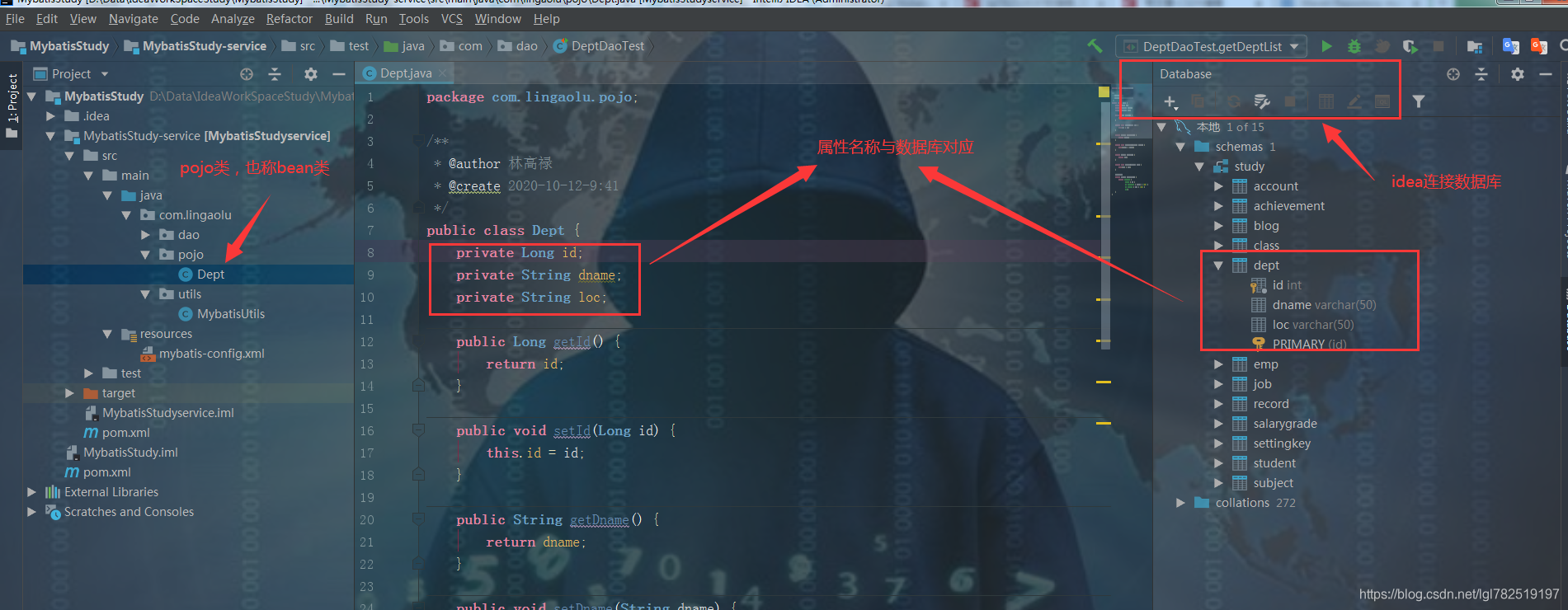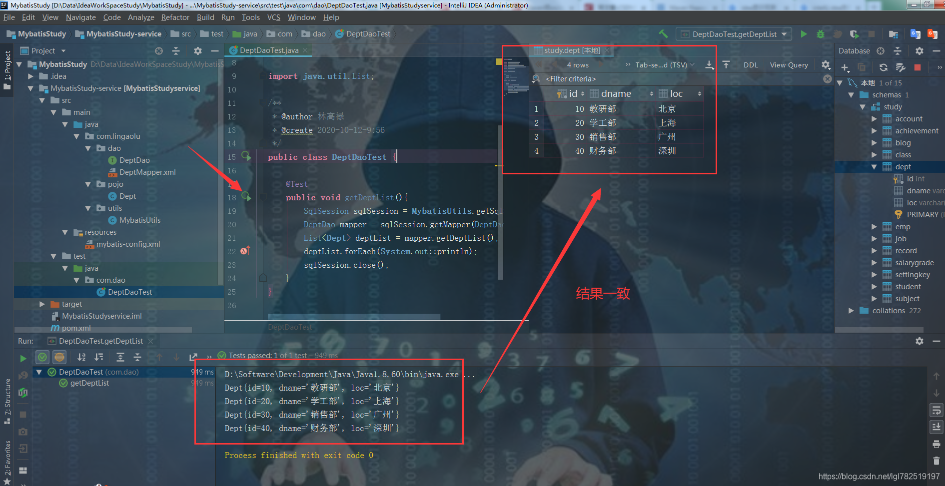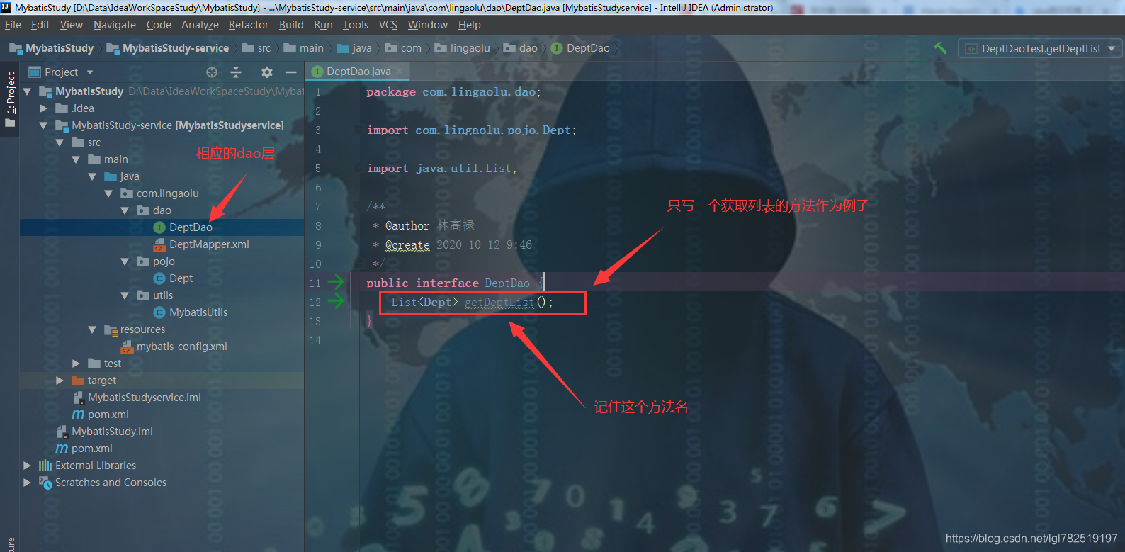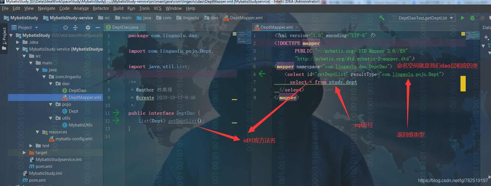 <?xml version="1.0" encoding="UTF-8" ?> <!DOCTYPE mapper PUBLIC "-//mybatis.org//DTD Mapper 3.0//EN" "http://mybatis.org/dtd/mybatis-3-mapper.dtd"> <mapper namespace="com.lingaolu.dao.DeptDao"> <select id="getDeptList" resultType="com.lingaolu.pojo.Dept"> select * from study.dept </select> </mapper>