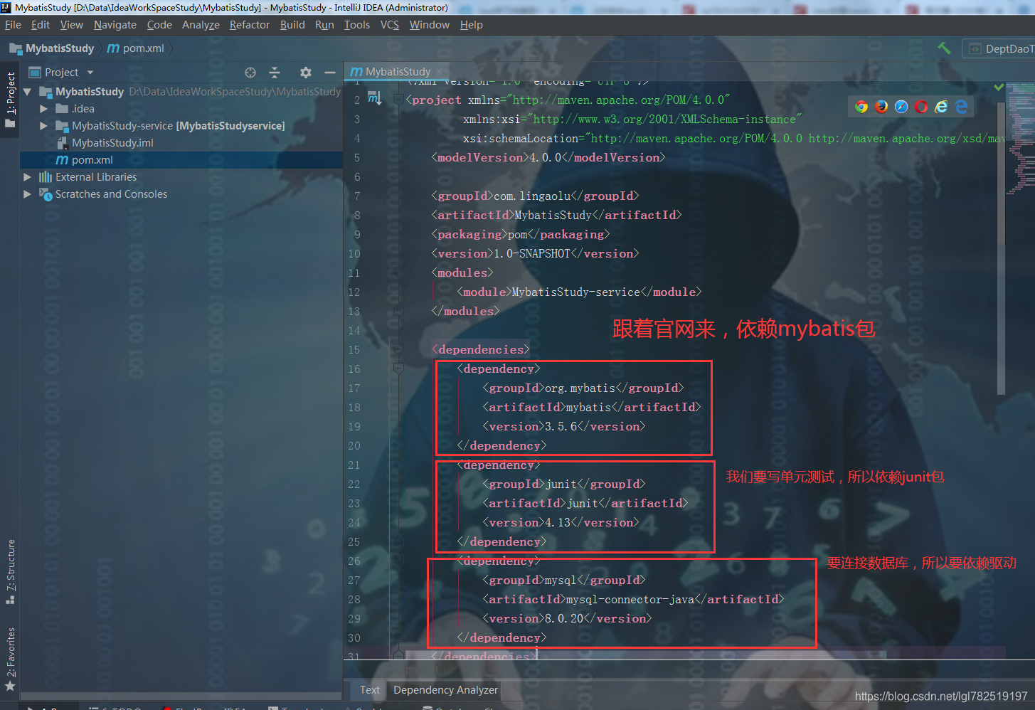 <dependencies> <dependency> <groupId>org.mybatis</groupId> <artifactId>mybatis</artifactId> <version>3.5.6</version> </dependency> <dependency> <groupId>junit</groupId> <artifactId>junit</artifactId> <version>4.13</version> </dependency> <dependency> <groupId>mysql</groupId> <artifactId>mysql-connector-java</artifactId> <version>8.0.20</version> </dependency> </dependencies>