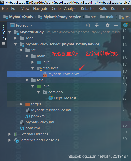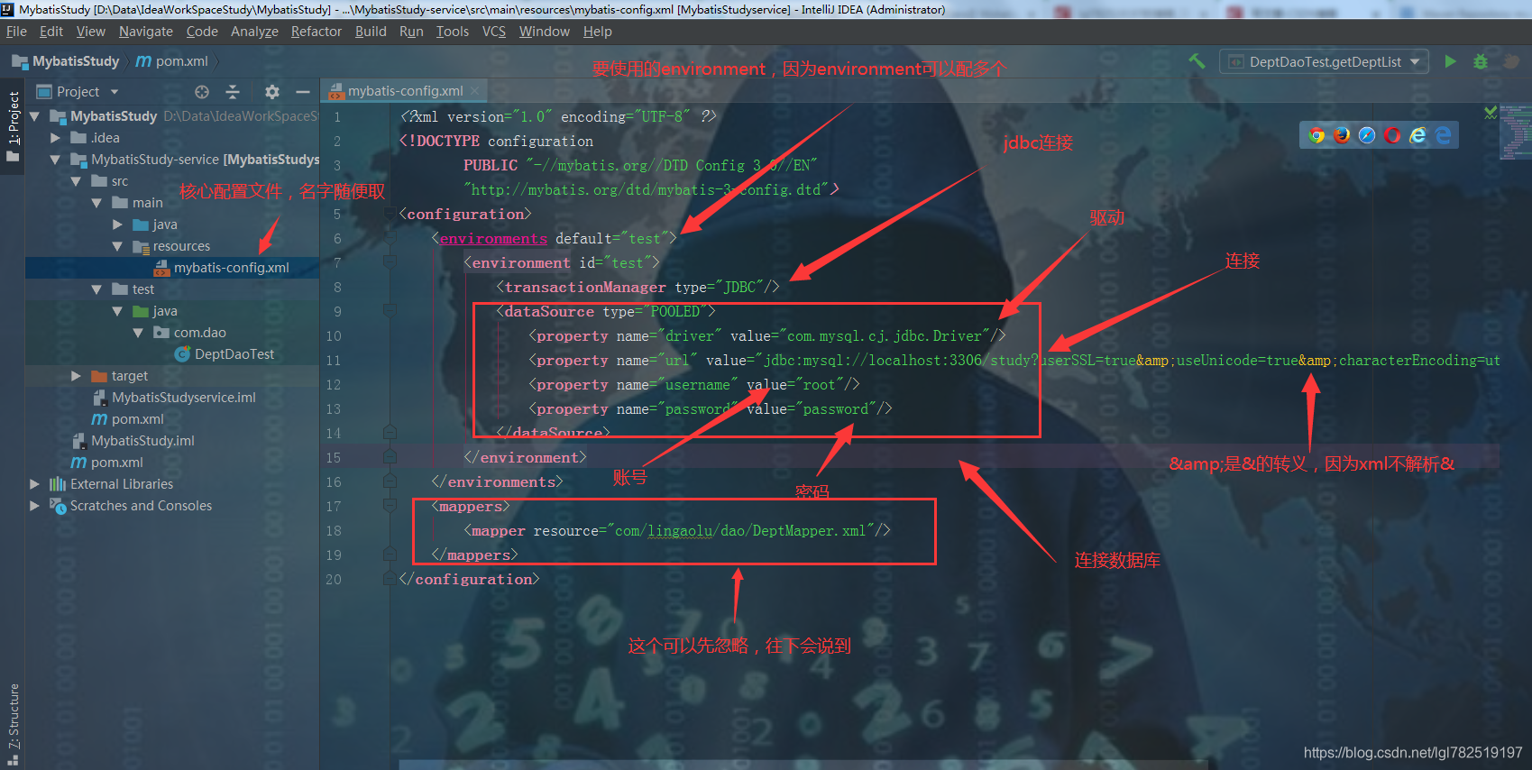 <?xml version="1.0" encoding="UTF-8" ?> <!DOCTYPE configuration PUBLIC "-//mybatis.org//DTD Config 3.0//EN" "http://mybatis.org/dtd/mybatis-3-config.dtd"> <configuration> <environments default="test"> <environment id="test"> <transactionManager type="JDBC"/> <dataSource type="POOLED"> <property name="driver" value="com.mysql.cj.jdbc.Driver"/> <property name="url" value="jdbc:mysql://localhost:3306/study?userSSL=true&useUnicode=true&characterEncoding=utf-8&serverTimezone=Asia/Shanghai"/> <property name="username" value="root"/> <property name="password" value="password"/> </dataSource> </environment> </environments> <mappers> <mapper resource="com/lingaolu/dao/DeptMapper.xml"/> </mappers> </configuration>