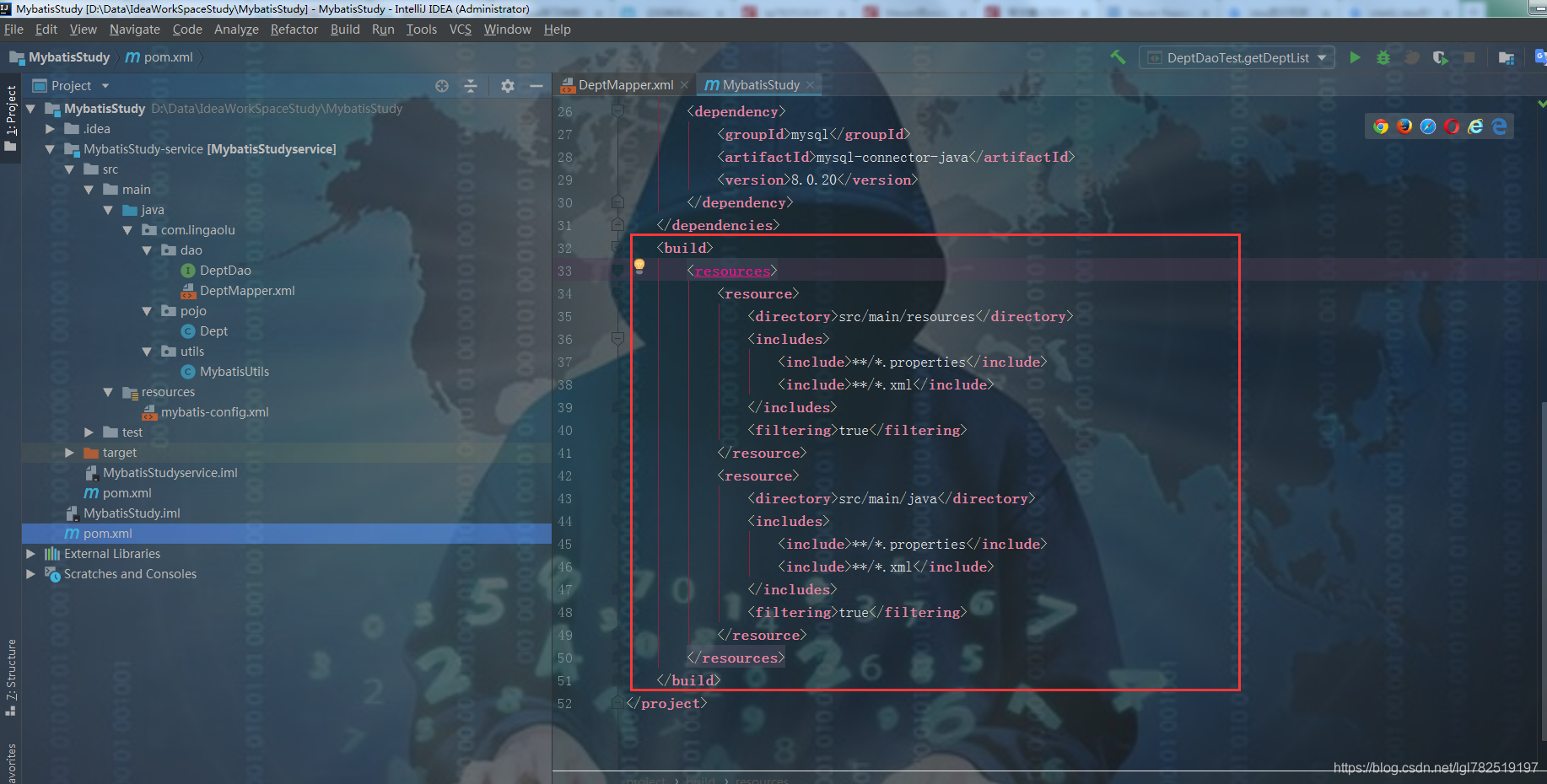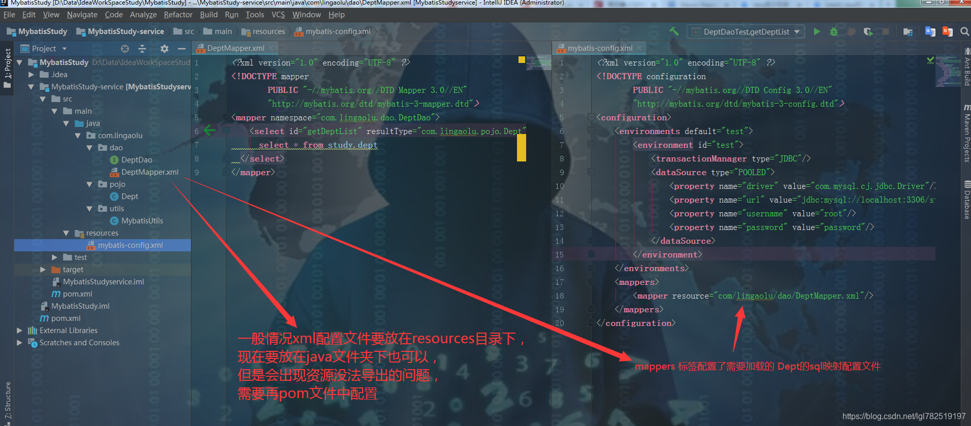因为目前我们的DeptMapper.xml文件是放在java文件夹下的,所以会出点资源找不到大的问题,具体问题为Maven项src/main/java目录下配置文件无法被导出或者生效的问题和处理方案