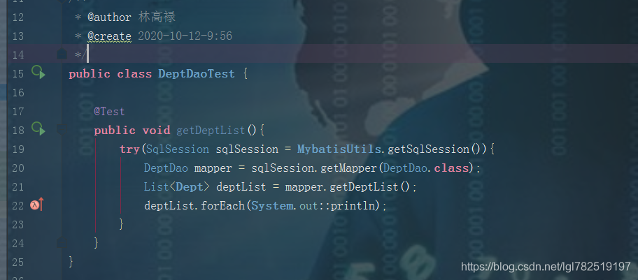 package com.dao; import com.lingaolu.dao.DeptDao; import com.lingaolu.pojo.Dept; import com.lingaolu.utils.MybatisUtils; import org.apache.ibatis.session.SqlSession; import org.junit.Test; import java.util.List; /** * @author 林高禄 * @create 2020-10-12-9:56 */ public class DeptDaoTest { @Test public void getDeptList(){ try(SqlSession sqlSession = MybatisUtils.getSqlSession()){ DeptDao mapper = sqlSession.getMapper(DeptDao.class); List<Dept> deptList = mapper.getDeptList(); deptList.forEach(System.out::println); } } }