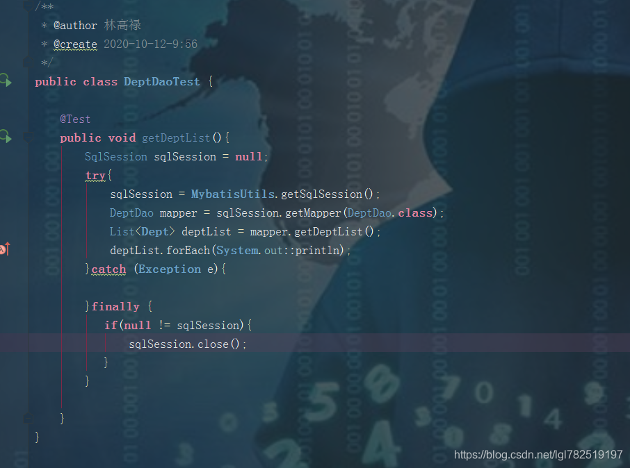 package com.dao; import com.lingaolu.dao.DeptDao; import com.lingaolu.pojo.Dept; import com.lingaolu.utils.MybatisUtils; import org.apache.ibatis.session.SqlSession; import org.junit.Test; import java.util.List; /** * @author 林高禄 * @create 2020-10-12-9:56 */ public class DeptDaoTest { @Test public void getDeptList(){ SqlSession sqlSession = null; try{ sqlSession = MybatisUtils.getSqlSession(); DeptDao mapper = sqlSession.getMapper(DeptDao.class); List<Dept> deptList = mapper.getDeptList(); deptList.forEach(System.out::println); }catch (Exception e){ }finally { if(null != sqlSession){ sqlSession.close(); } } } }