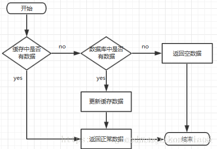 前台请求,后台先从缓存中取数据,取到直接返回结果,取不到时从数据库中取,数据库取到更新缓存,并返回结果,数据库也没取到,那直接返回空结果。