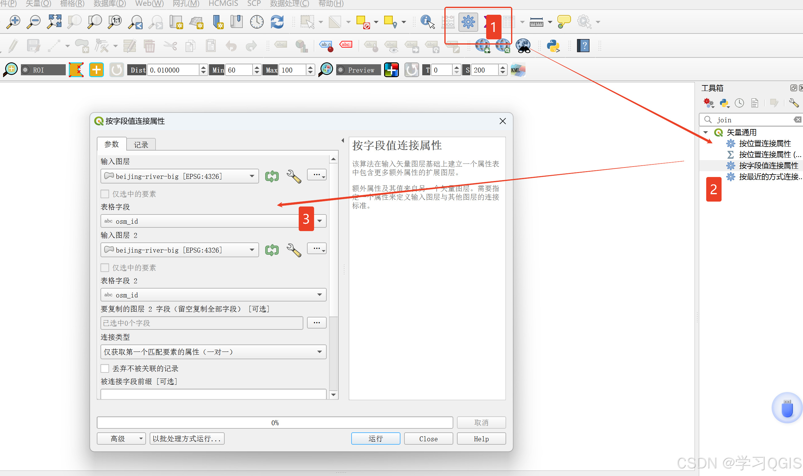 常见问题,有两个文件(可能是矢量shape或者CSV),两个文件要按照名称或者位置配成一个文件,对应EXCEL中就是常用的VLOOKUP函数,或者python中的merge函数,QGIS当中也有类似功能,比如join(矢量通用)功能。运行之后可以将两个文件链接起来。