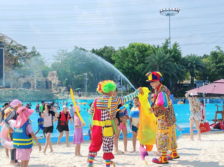 椰林摇曳、浪花轻拍,仿佛置身沉浸式的海岛式亲子互动欢乐场。阳光明媚的真沙滩造浪区,模拟自然海浪,营造逼真的海滨环境,适合不同年龄层共同体验,让大人小孩都能在椰风海韵中畅享安全又温馨的亲子时光~暑假每天都有演出火热进行中~滑稽的小丑兄弟瞬间成了孩子王,让每个到来的小朋友都能得到快乐的体验,收获小小礼品~