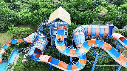 彩虹滑梯堪称鹭湖水世界的速度担当,远远看去,高耸的滑道仿佛一条直插云霄的银龙,极具震撼力,光是那陡峭的坡度和蜿蜒的轨迹,就足以让人热血沸腾。当你从高高的起点出发,趴在滑行垫上,在重力的作用下,身体会如离弦之箭般顺着近乎垂直的滑道飞速下滑。